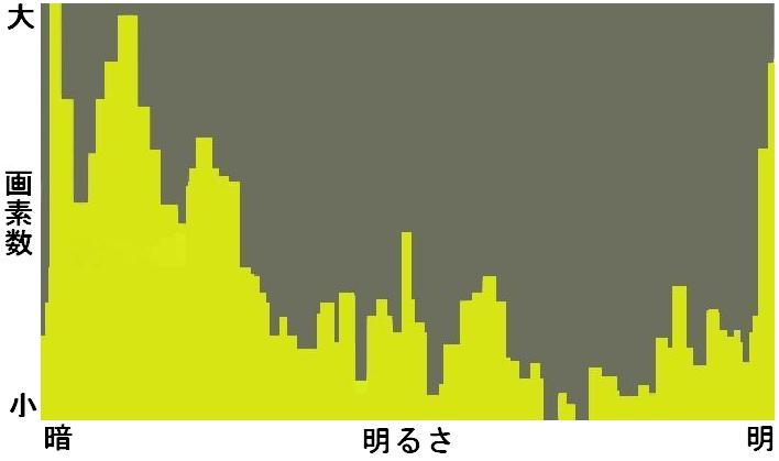 ※分布が左に偏っている場合は暗い画像、右に偏っている場合は明るい画像、 中央部に偏った山型の場合は明暗のバランスが適度といったことが読み取れます。